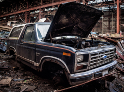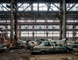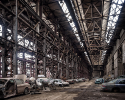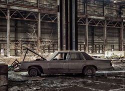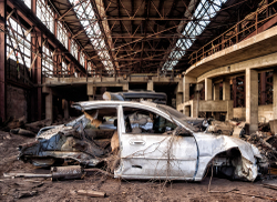 I discovered that the building and the grounds around it were being used as an auto scrapyard. There were hundreds of cars and trucks on the property, and the ones inside the building were in worse condition than the ones outside. Several collapses has squashed cars beneath them, and the atmosphere was very tense as at different points I heard people talking outside the building and dogs barking. It didn't seem as though anyone was coming inside, but it was hard to relax when I was constantly having to hide in darker areas until noises that may or may not have been related to my presence died down.