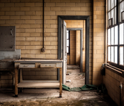 When I finally made it into the long hallway containing most of the original equipment, I felt very exposed. At the end of the hallway the bay for trucks to drive in and out was wide open, and at any moment a truck could have driven by or into the building leaving me with no real recourse for escape. I also kept hearing loud metallic crunching noises that I assumed were from a car crusher or some other manner of work they were doing outside - until I saw a huge claw-armed bit of machinery ripping steel out of the ceiling at the end of the hallway I was photographing. Deciding that at this point I had photographed as much as I needed to, I left quickly, thankful that I had been able to see as much as I did undetected.