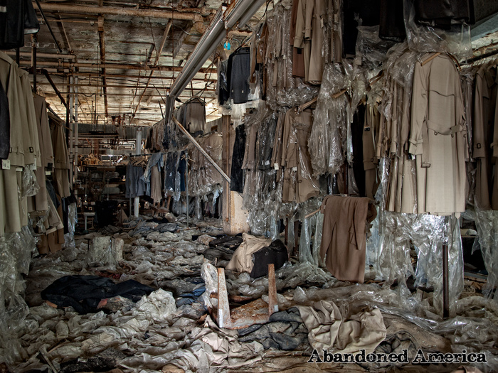 When I visited the factory in 2008, it was still full of hundreds upon hundreds of coats, many still in their plastic slip covers and in perfect condition. As we entered the main gate a young man with soot on his face was leaving. He asked us what we were doing, and we replied, "What are YOU doing?" He looked sheepish for a second then replied, "Scrapping." Upon entering the factory I was struck by two things: the first was that any errant spark from cutting metal out would turn the place into a maze-like inferno. The second was that it would be infinitely easier to steal coats and sell them than it would be to cut out scrap.