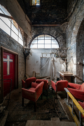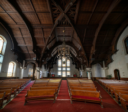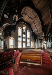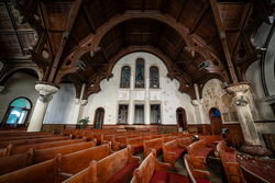 It’s unclear when the church closed, but the last listing for events at the church was a free reading of Ain Gordon’s play If She Stood in 2016, and it was listed for sale in 2018. When I photographed it in 2019, it was in relatively good condition despite some peeling paint and water damage towards the north entryway. I’ve heard that not long after I went there, the Tiffany arch was removed, and the pews were cut up, but I’m not sure for what purpose. The building is still clearly vacant, now covered with graffiti, and the lovely Tiffany stained glass windows are boarded over. At some point between August 2019 and November 2020, the roof on the rear portion of the building, which housed the Sunday School and lecture space, collapsed. Between November 2020 and 2022 that section was demolished, and shockingly, the tower, which was one of the most notable features of the exterior and appeared structurally sound, was entirely clipped off.