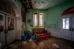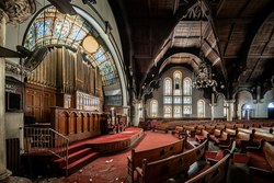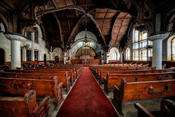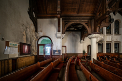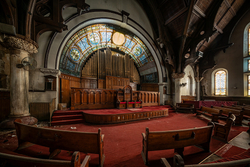 Detail view of the pulpit at the abandoned Macedonia Free Will Baptist Church in Philadelphia