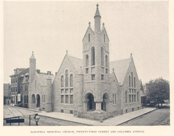 As Philadelphia’s population grew in the years following the Civil War, churches eyed growing neighborhoods in areas that were, at that time, on the city’s outskirts. The Spring Garden Street Presbyterian Church saw the corner of 21st Street and Columbia Avenue (now Cecil B. Moore Ave.) as a prime location for expansion and commissioned architect Henry Augustus Sims to design a brownstone chapel for a new congregation. Sims worked with his brother James P. Sims on many projects and created plans for numerous churches, including the First Presbyterian Church on 21st and Walnut and the Church of the Advent in Cape May, NJ. Along with his brother, he also designed the Girard Avenue Bridge.